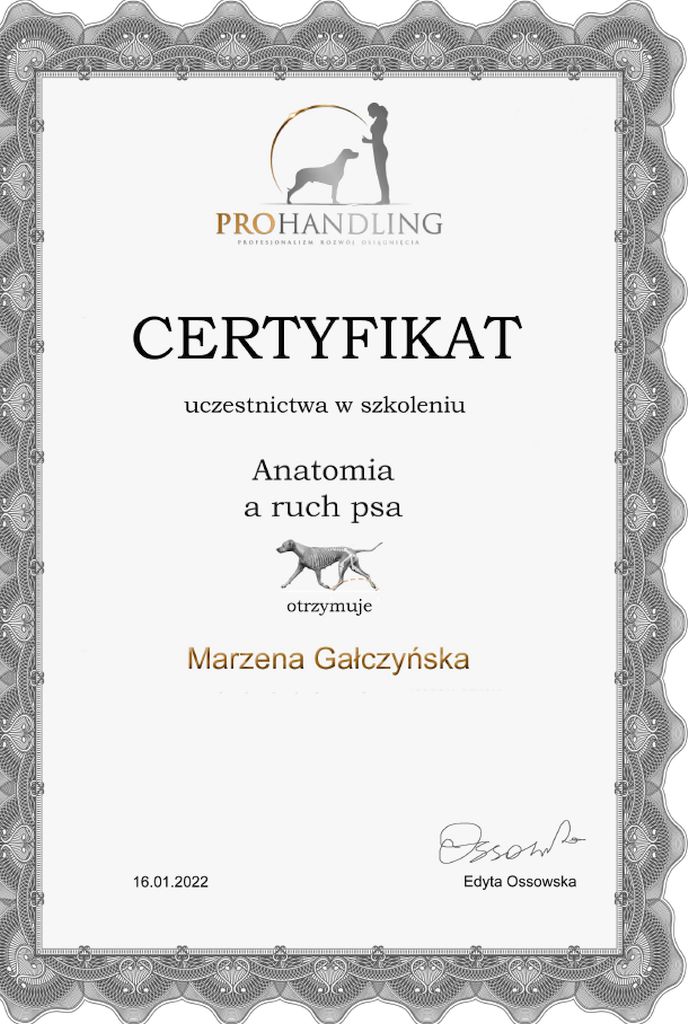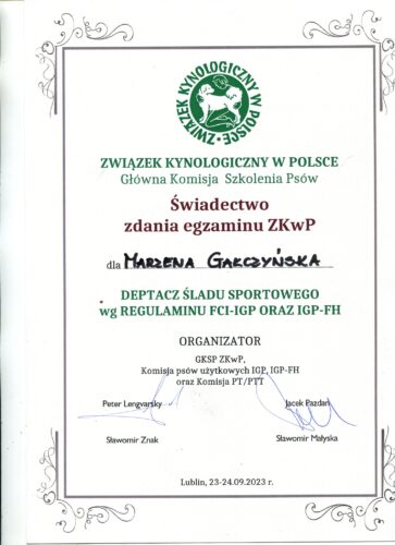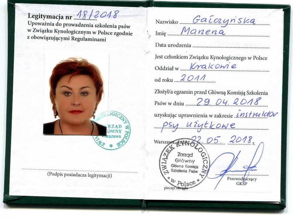 Aktualnie jestem sędzią krajowym prób pracy (BH-VT, IGP, IFH, PT, PTT), instruktorem szkolenia psów użytkowych ZKwP, aktywem sekcji owczarka niemieckiego ZKwP O/Kraków, czynnym sportowcem i organizatorem imprez kynologicznych. Za zasługi dla ZKwP zostałam uhonorowana w 2019 roku brązową odznaką, a następnie w roku 2023 odznaką srebrną.