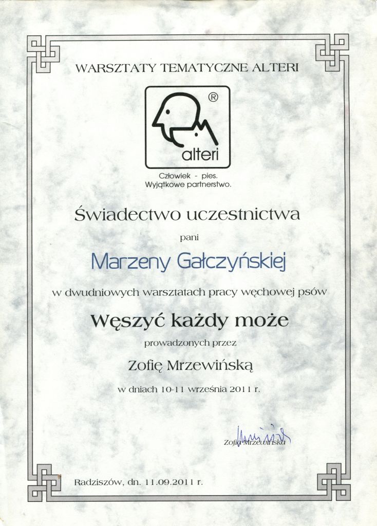 Ze wszystkich aktywności kynologicznych, mnie najbardziej interesuje praca węchowa psów. Jest to dziedzina o tyle fascynująca, o ile jeszcze nie poznana. Staram się zgłębiać tą wiedzę w codziennej pracy z psami oraz na licznych seminariach poświęconych pracy węchowej.
