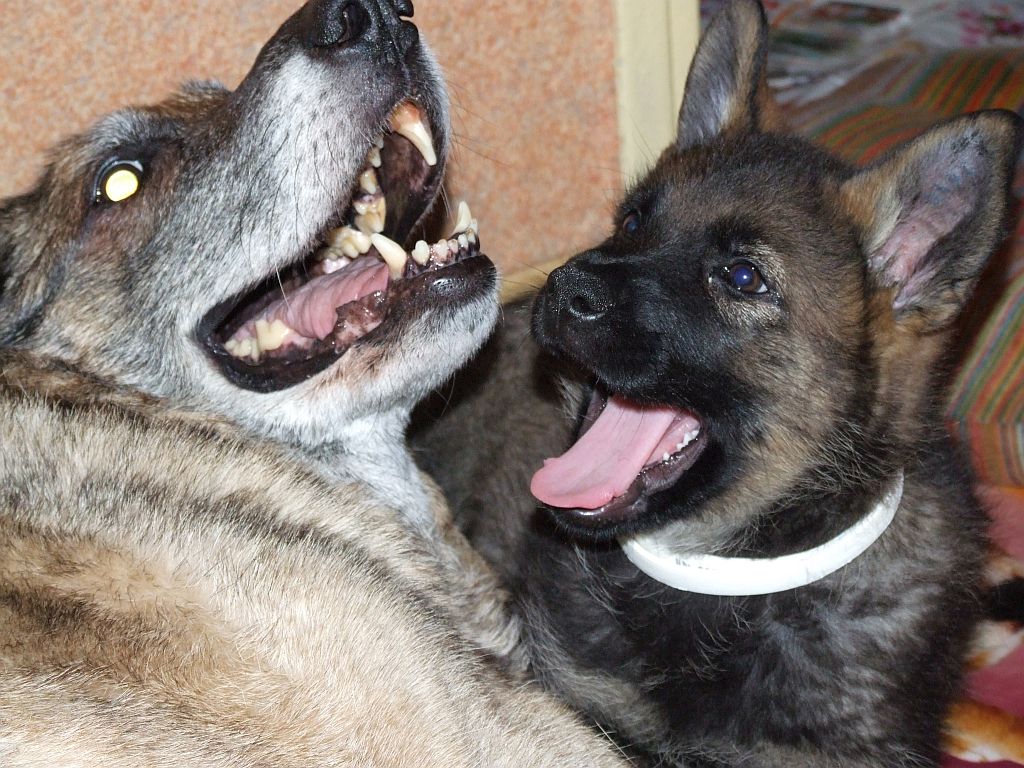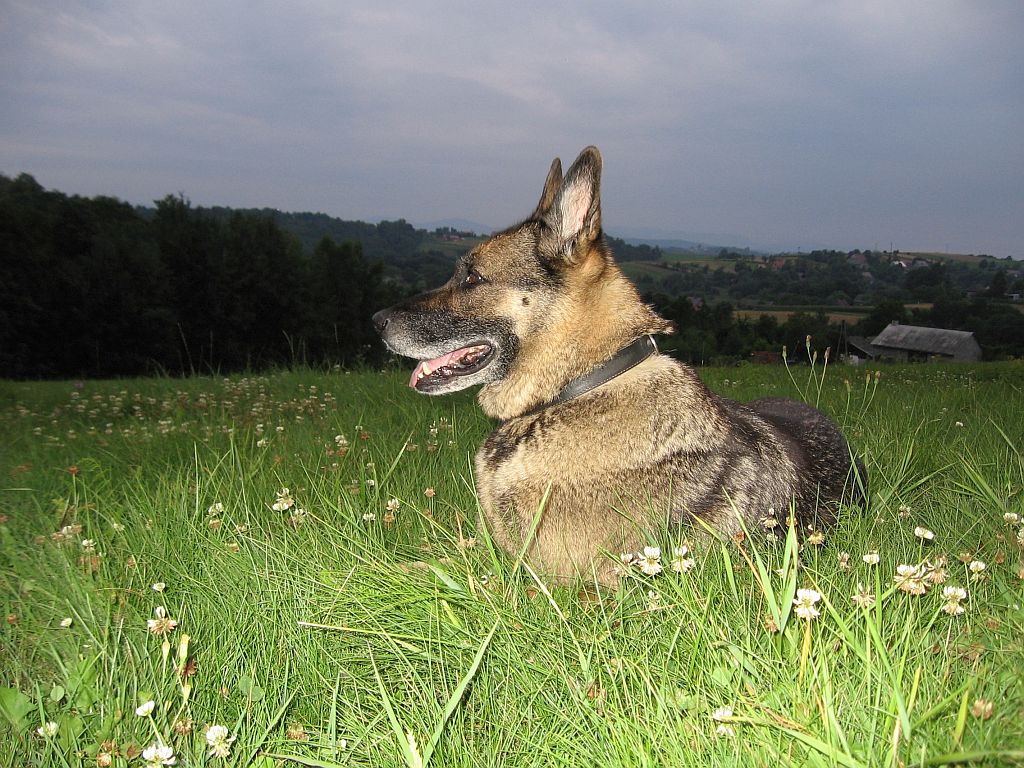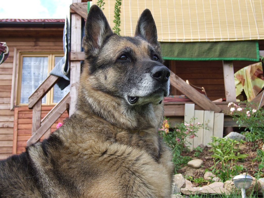 Nie da się ukryć, że jednak cały czas marzyłam o owczarku niemieckim. I kiedy już usamodzielniłam się, założyłam własną rodzinę, a i sytuacja umożliwiła mi zakup psa, zaczęłam o tym intensywnie myśleć. Jeszcze nie mówiłam tego wprost Mężowi, jeszcze tylko coś wspomniałam od czasu do czasu o psie, ale już grunt urabiałam. A że był, ten grunt, bardzo podatny, to i długo to nie trwało. Pewnego dnia Mąż nie wytrzymał i mówi: masz tu gazetę (to nie była era komputerowa jeszcze) i dzwoń, jedziemy kupić psa, bo nie zdzierżę. A jakiego chcesz, może jamnika, albo coś w tym stylu. No nie, o czymś większym myślałam. I tak od słowa do słowa okazało się, że obydwoje z Mężem o owczarku niemieckim marzymy. Zadzwoniłam, wsiedliśmy w samochód i pojechaliśmy do małej, domowej podkrakowskiej hodowli. Chcieliśmy samca, ale okazało się, że wszystkie są sprzedane bądź zarezerwowane, jeden wstępnie, że możemy ewentualnie zapytać o niego za 3 dni. 3 dni czekać – o nie!!! A Mężowi tak w ogóle jedna z suczek się spodobała – weźmy ją, poprosił. Tak też zrobiliśmy i w ten sposób nastał u nas pierwszy wilczasty owczarek niemiecki z linii użytkowej, DONA spod Chorągwi. Pierwsza noc była straszna – sunia tak okropnie płakała, że całą noc trzymałam ją na kolanach w fotelu. Ale kolejne dni były coraz lepsze. I tak wspólnie przeżyliśmy przeszło 15 lat dochowawszy się i małych burasków. Teraz wiem, że mieliśmy wiele szczęścia, bo hodowli nie sprawdziliśmy, niewiele wiedzieliśmy o owczarkach niemieckich, o ich chorobach, potrzebach, i to pomimo naczytania się wielu książek i oglądnięciu niejednego filmu, a trafiliśmy na sukę o wyjątkowym zdrowiu, chętną do pracy, zrównoważoną.