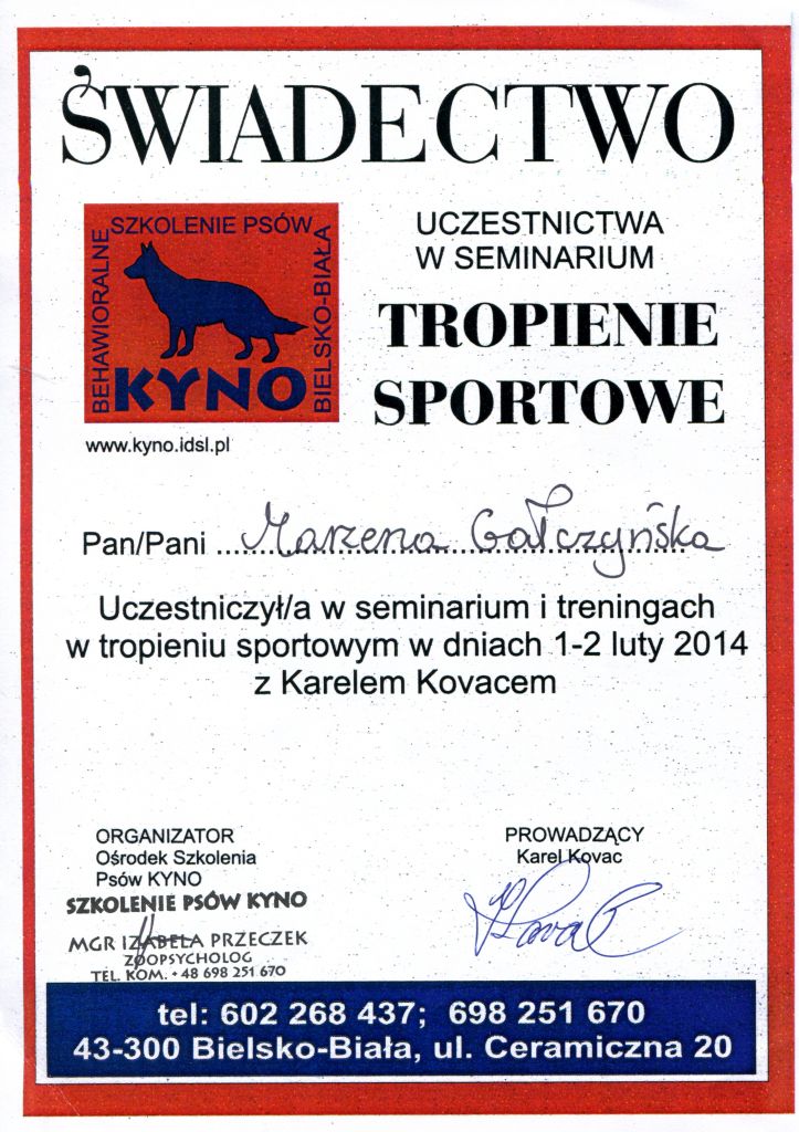 Kupując w roku 1996 moją pierwszą sukę owczarka niemieckiego użytka wiedziałam, że chcę iść na podstawowe szkolenie, ale to tyle. Trafiłam do szkoły nieżyjącego już Pana Marka Szczepańskiego (aktualnie Psia Eskadra). I ……..wciągnął mnie sport kynologiczny, wciągnęły mnie szkolenia.