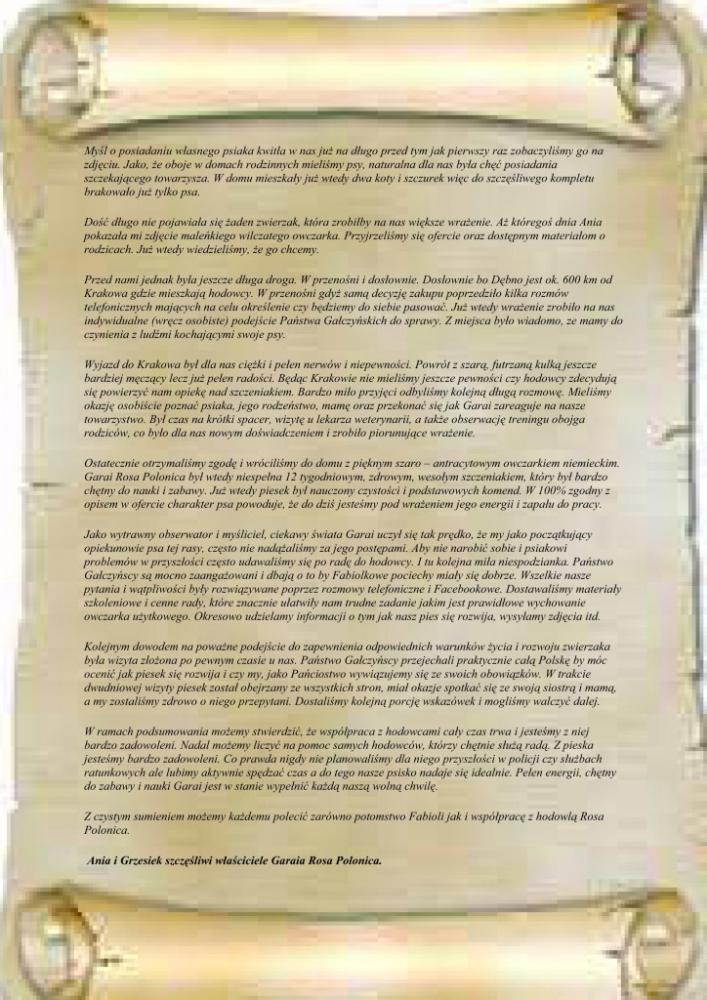 GARAI – ciemnowilczasty, dorodny samiec. Doskonały popęd łupu, świetny węch, który właściciele wykorzystują w tropieniu użytkowym. Mieszka w Dębnie.